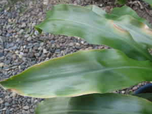 日当たりの好きな観葉植物でも、日陰で育てていたものや購入したばかりのものを急に強い日差しに当てると、葉が白っぽくなったり一部茶色くなって焼ける事があります。はじめは午前中の弱い日差しやレースカーテン越しに短い時間当てる事から、徐々に直射日光に慣らせるようにします。真夏の日差しに限らず、5月の日差しでも焼ける事があるので注意してください。
