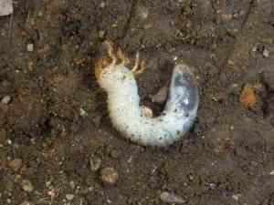 春の植え替えの時に土の中にいて、根が食べられている事があります。これは前の年、戸外に置いているものに成虫が卵を産んでふ化したものです。戸外に置いて育てているものにはオルトランDX粒剤を7月中旬と8月中旬に株元に散布して予防しておくとよいです。1カ月ぐらい効力があり臭うので、室内に入れる1カ月半ぐらい前までに散布を終えていた方がよいです。