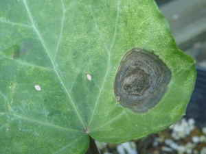 カビによるもので葉と茎に発生します。いずれも褐色の斑点ができます。枯れかけた葉などに病気が発生する事が多いので、できるだけ取り除くようにします。予防にダコニール1000、ジマンダイセンなどの殺菌剤を定期的に散布しておくとよいです。
