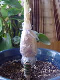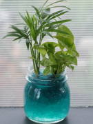 テーブルヤシのような観葉植物は明るい室内で育つのでハイドロカルチャーに向いています。種まきから発芽したミニ観葉植物がよく売られているので、これを利用してハイドロカルチャーに利用できます。右のは色のついたジェルのようなものを中に入れて育てるタイプです。見かけがご覧のようにカラフルで、他にピンクや黄色などもあります。作り方は中にジェルのようなものを入れるだけです。ジェルには水分と栄養分があるので水やりと肥料は不要で、ポリマーが減ったら足すというものです。もしお求めなら楽天市場