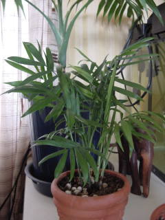 水やり水切れすると葉先が枯れるので、生育期の5月から9月は表面が白く乾く前に与えます。秋の9月下旬からはだんだん水やり回数を減らし、冬は表面が白く乾いてから与えるようにします。空中湿度を好みますので、霧吹きで葉に湿度を与えて、葉ダニの予防、葉の乾燥による枯れを防ぎます。また、真冬は暖房などで空気がよく乾燥するので、霧吹きで葉に湿度を加えるようにます。春になって暖かくなってくると、だんだんと水を吸いはじめて乾くのが早くなるので、表面が乾いてきたら十分に与えます。その他は観葉植物の水やりを参考にしてください。植え替え鉢の底から根が出て根詰まりしてしまったり、根が痛んで新芽の伸びが悪かったり、ここ3年以上は植え替えていない株は、春の植え替えをします。時期は5月から6月頃に行うのが理想的です。用土は市販されている観葉植物専用の土でかまいません。自分で作る場合は赤玉土(小)6、腐葉土4ぐらいで植え替えます。その他は観葉植物の植え替えのページを参考にしてください。肥料5月から10月まで緩効性の化成肥料を置き肥したり、液体肥料などを定期的に与えます。その他は観葉植物の肥料のページを参考にしてください。冬を越えた春のテーブルヤシテーブルヤシは寒さに比較的強く、冬の間は成長しないまでも、多少葉に枯れがあり色褪せている程度で、姿は秋とあまり変わっていないものです。もし、冬の間極端に姿を乱した株や、葉が垂れて元気がないような株は、根腐れの可能性がありますので、春の植え替えをしてください。テーブルヤシは葉が成長するスピードが遅く、全体的に葉が枯れて減ってしまうと、元に戻るまでにかなり時間が掛かってしまいます。あまりにも酷い場合は、買い替えた方が良いかも知れません。冬の管理方法観葉植物の冬の管理を参考にしてください。取り木テーブルヤシは挿し木で増やすことはできません。切った元の株からは新芽が出ないからです。下葉が枯れ上がって姿がみだれたり、背丈が高くなり過ぎたら、株を取り木をして姿を回復させるようにします。発根させたい場所に3cmぐらいの切り込みを入れて、そこに湿らせた水ゴケを巻いて、そこをビニールで包みます。テーブルヤシは発根するまでに1〜2年と長くかかってしまうので、気長に行なわなければなりません。根が十分に発根したのを確認したら親株から切り離して植え込みます。切り離した元の親株から新芽はでません。取り木の失敗