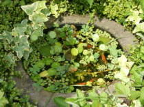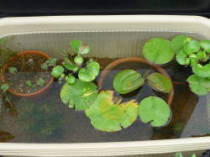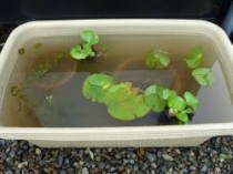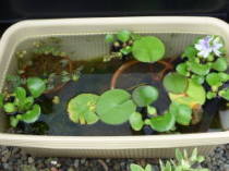 メダカが泳ぎまわれて水草が植えられるスペースがあれば何でもよいです。例えばスイレン鉢、鉢底に水が抜けないようにできる栓付きのプランターなど、写真はうちにあった臼や火鉢を使ったものです。大きい方が沢山の飼えて多くの水草を植えられるので、市販されているプラ池やコンクリートを混ぜるトロ船などを使ってもよいです。![]() プラ池 |