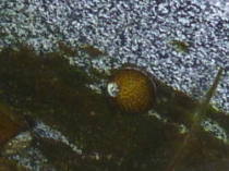 必ず必要ではないですが、石巻貝やヒメタニシという貝を入れておくと、容器に着いた苔を食べてくれます。石巻貝は河口でしか繁殖できないので増えませんが、ヒメタニシは夏ごろに子供を産んで増えます。数は10リットルにつき2匹ぐらいを目安に入れるとよいと思います。![]() 苔を食べる石巻貝 |