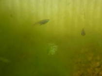 アオミドロが大繁殖する事がよくあります。水に酸素を供給したり、産卵場所になってよいのですが。増えすぎると泳ぎ回れるスペースが少なくなってしまいます。増えすぎてしまったら古歯ブラシなどを使って減らすとよいです。ですが冬は寒さで水草が減ってしまうので、酸欠を防ぐために多少残しておいた方がよいと思います。エアーレーションを使うとあまり増えなくなりますが、電源が必要になるのでビオトープとは言えないものになります。![]() アオミドロ |
