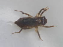 ヤゴはトンボの幼虫でメダカを食べてしまいます。トンボは水の中に卵を産むので、飛びまわっている時期は、ネットなどをして生ませないようにすると予防できます。もし春に掃除する時に見つけたら、すぐ近くに池などがあれば逃がしてあげるとよいと思います。![]() ヤゴ |