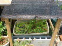 日当たりのよい所では、夏になると強い日差しが照りつけ、プラスチック製のプランターなどで作ったビオトープははお湯みたいになってしまいます。メダカはある程度の高温には耐えますが、やはり限界があるので、水温が上がり過ぎる場合は遮光ネットやスダレで遮光してあげるとよいです。日陰に置いてもよいのですが、睡蓮などの植物は日当たりのよい所で花を咲かせるので、花が咲かなくなってしまいます。また、プラスチック製の容器は薄いので、直射日光の当たる所にブロックなどを置いて、強い日差しから守るとよいです。![]() 遮光ネットとブロック |