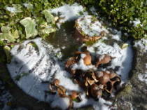 冬になって水温が下がると、活発に泳ぎまわらなくなります。子メダカは比較的泳いで、少しは餌を食べるのですが、親メダカは食べなくなり底の方にじっとして姿を見せなくなります。氷は表面だけ凍るぐらいなら死にませんが、底の方まで凍るといけないので、寒い日が続く場合は厚くならないよう、薄いうちに取って上げた方がよいです。氷をお湯で溶かすると、水温が急に変化してよくないので注意してください。薄氷が張るぐらいの寒さなら、上に段ボールなどで覆うと、多少の効果があります。![]() 凍った臼(メダカ8匹ほど冬眠中) |