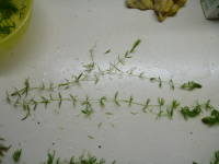 茎が長く伸びるので、伸び過ぎたら手で切り分けるとよいです。手で切り分けたら土に埋めたり、水面に浮かべて育てます。![]() 切り分け前 |