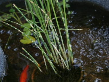 シマフトイは池や沼の浅瀬で育つ水生植物です。長い茎に白い横縞の模様が入るのが特徴です。縞模様は特に春に出ますが、環境などで縞模様が無くなってしまう事があります。ビオトープや睡蓮鉢などでは、株元まで水に沈めて育てればよく、鉢植えでは水を入れた受け皿に漬ける腰水栽培でもかまいません。冬は地上部が枯れますが、春になって暖かくなるとまた伸びてきます。