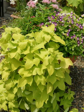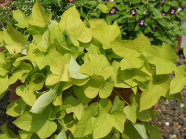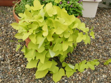 冬の寒さには弱いので、鉢植えを室内の暖かい所に置けば常緑で越冬します。室内に入れられない大きな鉢植えや、花壇に植え付けているものは、葉が枯れる11月頃になったら芋を掘り上げ、新聞紙などにくるんで段ボールなどに入れ、5度以上の室内で、暖房の効いていない、寒暖の少ない所で越冬させるとよいです。春の5月頃になったら植え付けます。![]() イポメアの芋 |