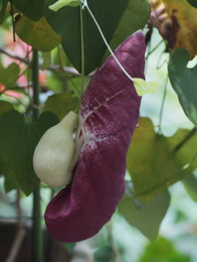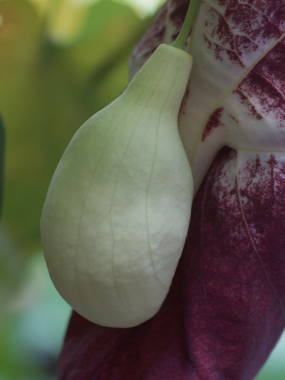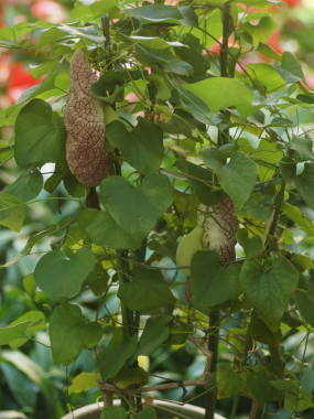 アリストロキアの仲間は、温帯から熱帯に500種類ほどが分布しています。主な種類は花径が10cmぐらいのリットラリス、花径が30cm以上になるギガンテア、花がパイプ型をしたリンゲンスなどがあります。花は茶褐色で、ユニークな姿をしており、花に見えるのは花の萼で、裏には筒状のものがついています。常緑蔓性の種類が多く、アンドン仕立てなどにして、育てられる事が多いです。