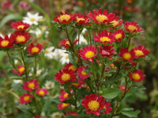 一重咲き、半八重咲、八重咲き、ポンポン咲きなど、いろいろな咲き方をする種類があります。花色は豊富で大きさも10cm以上ある大輪から、2cmぐらいの小輪を咲かせる種類もあります。草丈は80cmぐらいになりますが、20cmぐらいの矮性品種もあります。園芸の観賞用としても人気がありますが、昔は仏花として、今でも花瓶に生ける切り花にも人気です。![]() 八重咲き |