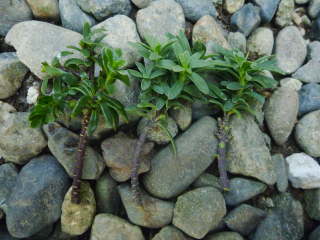 時期は春の5月頃、秋の10月頃に行えます。長さ5cmぐらいの挿し穂を用意して、下の方の数枚の葉を取ってその節が用土に埋まるように挿します。用土は酸性土壌を嫌うのでパーライトや川砂を混ぜて挿すとよいと思います。1ヶ月もすると芽が伸びてくるので、春に挿した場合は10月頃に鉢上げして翌年に開花させるようにします。秋に挿した場合は早春に鉢上げしますが、生育がゆっくりなので花が多く咲くのは再来年からになると思います。| 5月上旬 |