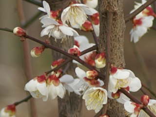 300種類以上の品種があると言われています。花だけを見ても、交配で作られた見分けがつかないものも沢山あります。花色は白、濃い紅色、薄い紅色で桃色がかった花を咲かせる種類、花の形は八重咲きが多いですが一重咲きもあります。中には「思いのまま」や「春日野」のように白、桃色の混じった花を咲かせる品種もあります。枝垂れ梅も緑萼枝垂れ、藤牡丹枝垂、紅枝垂など沢山の品種があります。![]() 八重の白 |
