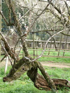 幹が左に捻じれ龍のように地を這って伸びる事からこのような名前になっています。写真は大分市の吉野梅園にある臥竜梅です。鎌倉時代に福岡の太宰府から枝を持ち帰ったのが始まりで、古いものは樹齢850年というの古木もあります。大分市にあるのは一重の白花ですが、大牟田市の普光寺にあるのは八重の紅花、仙台には八重の白花、一重の白花、八重の紅花もあります。仙台にあるのは朝鮮半島から持ち帰ったのが始まりだそうです。なぜこのような樹形になるのかは分かっていないようです。![]() 臥竜梅 |