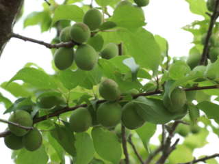 小梅を除いた実が大きい品種は、摘果すると実が大きくなります。実が小さ過ぎる頃に行うと落ちて実が減る可能性があり、逆に大き過ぎると効果が薄いので、大豆ぐらいの大きさになって行うのがよいです。大体10cm以下の短い枝に1個から2個残すように、長い枝は5cm〜10cmぐらいの間隔に1個が目安になります。実の収穫