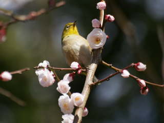 梅や椿の花が咲くとメジロが蜜を舐める姿をよく見かけます。この鳥の体は緑色で長さが12cmぐらいと小さく、目の周りが白くてかわいい鳥です。他の鳥と比べて警戒心が薄いので、木に止まっている写真を撮りやすいです。姿を見かける時期は12月頃からで、新緑が美しくなる3月中頃になると繁殖期で山へ戻り姿が見えなくなります。冬になったら甘いミカンを半分に切って枝に挿しておくと、毎日のようにつがいが来るようになります。ヒヨドリも好んで食べるので、ミカンの設置方法には工夫が必要です。![]() ウメとメジロ |