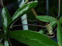 蔓性植物は朝顔のように蔓が巻き付いて上に登るもの、ウリ科のゴーヤのように巻き髭が巻き付いて登るもの、ノバラのようにトゲで登るもの、ツタのように着根という根が引っ付いて登ってゆくものなどがあります。緑のカーテンに向いている蔓性植物は、蔓や巻き髭が巻き付いて登ってゆき、夏までに沢山の葉が茂る種類が向いています。種類は特に下の一覧に限らず、探せばいろいろな植物があると思います。![]() 巻き髭 |