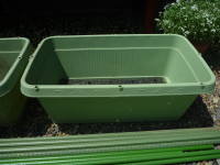 種まきから育てられるものは、種まきから苗を作ってもよいですが、早めに苗が入手できれば、早めに苗を植え付けると、葉が早く茂るのでよいと思います。鉢への植え付け方法は苗の植え付けのページを参考に、植えつけたら、ネットに紐やビニタイなどを使って誘因しておきます。![]() 左右2苗ずつ(ドイツ朝顔) 中央1苗(ノアサガオ) |