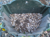 A スポンジを全て貼り付けたら、水はけをよくするため底に軽石などのゴロ石を敷きます。写真はゴロ石が少ないので、底が見えないぐらい入れます。ゴロ石を敷いたら一段目に苗が乗るぐらいの高さに用土を敷きます。用土についてはハンギングバスケットの用土をご覧ください。