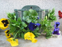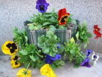 プラスチック製のハンギングバスケットはプラスチック製の鉢とスポンジが付属しています。プラスチック製の鉢の側面には苗を植えるための隙間が空いて、スポンジは中の土が外にこぼれないようにするためのものです。写真のスリットバスケットの植え付け苗は全部で10個のパンジーを使用しました。配置と配色は表のようにしましたが、自分の好みで苗の種類や配色をして植えればよいです。![]() スリットバスケットSLT-25 |