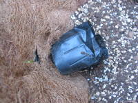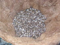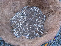 はじめに側面に根鉢を入れる穴を開けます。はさみを使って逆T字に根鉢が入りそうなぐらいに切れ込みを入れます。ヤシマットは厚いのでよく切れるはさみで切ります。今回の場合は、側面に9カ所切れ込みを入れました。根鉢を入れる切れ込みを入れたら用土を入れます。ヤシマットは水はけがよいので底に軽石は敷かなくてよいです。用土についてはハンギングバスケットの用土をご覧ください。