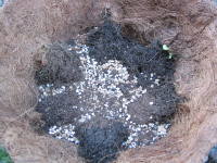 用土を加えた - 1段目に苗の根鉢を入れます。苗の根鉢を入れやすいように、根鉢の周りを軽く壊して小さくします。そのまま根鉢を切れ込みの穴に入れようとすると根鉢が壊れて入れにくいので、ポットの底の丸い部分を切り取ったポットを利用すると比較的入れやすくなります。ハンギングバスケットを吊り下げた時の目線に花が向くようにして隙間に用土を入れます。