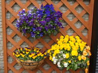 花やカラーリーフを寄せ植えにした鉢を、フェンスに掛けたり、木に吊るしたりして楽しむものを、ハンギングバスケットと呼ばれています。専用の鉢が売られているので、購入して気軽に楽しむ事ができます。鉢を下に置かずに済むので、場所をあまり取らずに楽しむ事ができます。季節の花を好み色合いで寄せ植えして楽しんだり、葉の美しいカラーリーフと寄せ植えにしたりして、自分好みに楽しめばよいと思います。![]() 壁掛け |