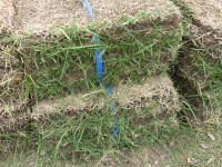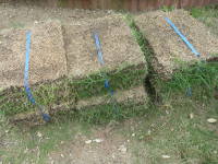 束になって売られているのが一般的で、一束に30cm×37.1cmの芝が9個、約1平方メートル分が入っています。中には30cm×30cmというのも売られている事があります。写真は近所で購入した高麗芝で全部で12束ぐらい購入しました。束を見ると、隅の方の芝が伸びていて、中央の方はあまり青々していませんでした。どうも束ねて時間が経っているようで、決してよい状態とは言えないものを購入してしまいました。![]() 高麗芝の束 |