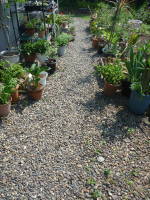 通路に石を敷いていたのですが、夏に石が焼けて周辺が暑くなるので、石に替えて芝生を張る事にしました。張る所は、日当たりが良く水の溜まらない、水はけがよい所がよいです。まずは張りたい所の石を全て取って、取った石の所に元肥の牛糞を混ぜた土を入れて耕しました。そして、トンボのようなものがあったので、それで土を平らにしながら石拾いをしました。![]() 石を敷いた通路 |
