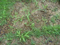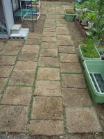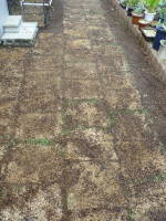 質が悪く生えない所があったので、来年の春に部分的に張りかえようと思っていたのですが、繁殖力が結構強く、意外と青々としてきました。所々茶色くなっている所は、来年の春に少し購入して、芝のない所を張り替えようと思っています。張る前は敷いていた石の周辺が焼けて暑くなっていたのですが、おかげで暑さが随分和らいで歩き心地もよくなりました。![]() 草が生えた |