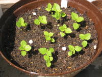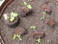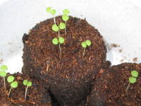 種が小さいので平鉢に蒔いて受け皿から水を吸わせたり、ピートバンやジフィーナインなどを使って種まきするとよいと思います。発芽するまでは用土を乾かさないようにして、本葉が2、3枚ぐらいになったらポットに仮植えします。本葉が5枚ぐらいになったら、10cmから20cmぐらいの間隔に定植します。下はジフィーセブンに種まきして、ちぎってそのまま鉢に植えつけました。仮植えを省きましたが、一度仮植えしてから定植した方がよいと思います。鉢植えの用土は赤玉土6、腐葉土4など、ごく普通の用土でかまいません。| 5月上旬 |