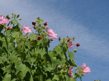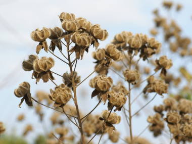 秋が深まると葉が枯れてしまいます。このような姿を枯フヨウとして観賞されています。枯れた姿も冬になると見苦しく感じますが、冬に剪定すると寒さで枝が痛む事があるので、暖かくなる春の3月頃に行うとよいです。高くなった幹は、枝が分岐するすぐ上で切ると、樹形がまとまった姿になります。花芽は春から伸びる新枝に着くので、枯れた枝のどこを切っても、花が咲かなくなる事はないです。![]() フヨウの剪定 |