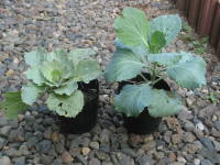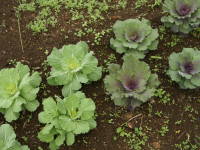 ハボタンの種まきは冬までに大きくしなければいけないので、時期は夏7月中旬から8月上旬に行います。夏の種まきは暑くて少し不安ですが、暖地でも比較的容易に行う事ができます。種まきの方法は箱まきで行えばよいと思います。ハボタンは発芽後に徒長しやすいので、双葉がしっかり出揃った頃にあれば100倍ぐらい薄めた矮化剤のビーナインを1回散布しておくと、徒長をある程度抑えることができます。本葉が2、3枚になったら9cmポットに仮植えして日当たりがよく風通しのよい所で育てます。9月になって根が回ってきたら鉢や花壇に定植します。植え付けの際は、株元の葉のない茎を埋めて高さを揃えて深植えして構いません。用土や株間は植え付けの項目と同じです。9月の植え付け時にもう1回、あれば200倍に薄めたビーナインを散布しておくと徒長を抑えられます。下のは普通の葉ボタンと葉に切れ込みがあるリアスという種類を、ビーナインでわい化処理して育てました。| 8月上旬 |