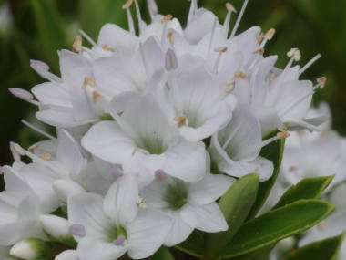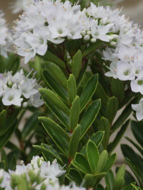 ヘーベ・グリーンフラッシュは100種類以上があるヘーベ属の中の一つの常緑低木です。1cmに満たない純白の美しい花が集まって咲き、2cmから4cmぐらいの大きさの花序を作ります。ーベ・ディオスミフォリアという名前で薄青色をしたものもあるようです。同じヘーベ属で花序が長い桃色や紫色の花を咲かせる種類は斑入りの種類もあります。