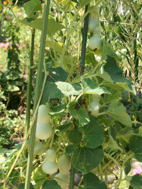 蔓が伸びて巻くつく支柱を立てるようにします。鉢植えでの小型ヒョウタンならアンドン仕立ても可能です。庭ではネットを張って緑のカーテンやキュウリのように栽培する事もできます。竹などで棚を作ってぶら下げると傷のない美しいものが出来上がります。場所