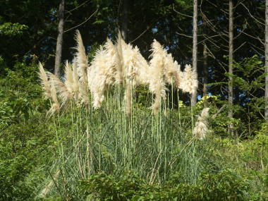 パンパスグラスは草丈が3m以上になる、ススキを巨大にしたような姿をしていています。花は柔らかい毛のようなのもが集まって花穂を作っています。風になびく姿は初秋の暑さ忘れさせてくれます。半耐寒性で寒さにはあまり強くありませんが、暖地では問題なく地植えで宿根して越冬します。白花の他に桃花、草丈が1mぐらいの小型の品種もあります。雌雄異株で、雌株だけに花穂が伸びます。