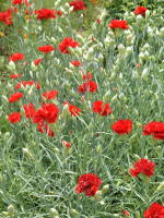 秋の9月〜10月頃にさし芽して来シーズンも開花させる事ができます。挿し穂はできるだけ株元に近い節から伸びた脇芽を利用するようにします。長さ5cmほどの挿し穂を20分ほど水揚げして、あれば発根促進剤をつけて挿します。40日ぐらいすると発根するのでポットなどに仮植えしておきます。11月中旬頃までに脇芽が増えるよう摘心して定植します。四季咲き性のカーネーションなら、春の4月から6月頃に挿して秋に開花させる事もできます。その他は挿し木のページを参考にしてください。![]() 若い挿し穂 |