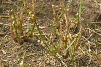 ポットに仮植えして、霜に当てないよう軒下でなどで育て、高さが10cmほどになったら節を二節ぐらい残すよう摘心して、わき芽の数を増やさせます。![]() 摘心前 |
