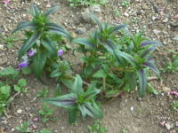 草丈の低い頃は横に這い上がるように伸びて強風にあおられやすいので、短い支柱などで支えておくとよいです。草丈が高くなっても、強風で倒れないように支柱で支えておくとよいです。![]() 横に這い上がるように伸びる |