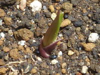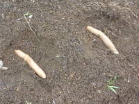 地温が高くないと芽が出ないので、球根の植え付け時期は4月から5月頃に行うとよいと思います。植え付け方は長い球根を横に寝かせて植え付けます。鉢植えでは6号鉢に1球、65cmプランターに3球を目安に、深さ5cmぐらいの深さに、用土は花の培養土や赤玉土6、腐葉土4などに植え付けます。庭では水はけが悪いようなら腐葉土を、元肥に牛糞などを混ぜ込んで深さ10cmぐらいに、間隔は20cmぐらいの間隔で植え付けます。右の植え付けは3月上旬と早過ぎて、芽が出たのは5月上旬でした。寒さに強くないので、早植えには注意してください。![]() グロリオサの植え付け |