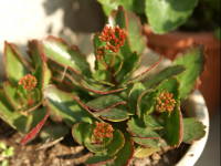 カランコエは短日条件で花芽がつく習性があります。よく見かけるブロッスフェルディアナ系は8月から9月頃まで、ベルのような花を咲かす種類は10月から11月頃までの間は電灯などの光が当たらない場所で育て短日条件にします。春から秋の間は電灯の光などの届かない場所で育てれば、意識しなくても自然に花芽が付きます。そのような場所がない場合は、花芽分化期は夕方5時頃から翌日の朝8時ぐらいまで段ボールなどをかぶせるようにします。ベルのような花を咲かせる種類は、短日条件と15度以下の低温に当てないと花芽ができないので、最低気温が10度を下回ってきたら室内に入れればよいと思います。![]() 2007/12月上旬 |