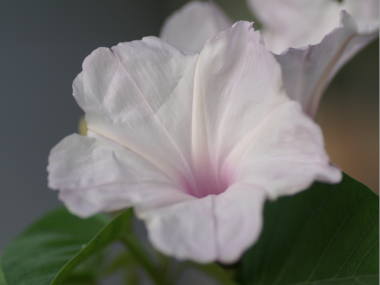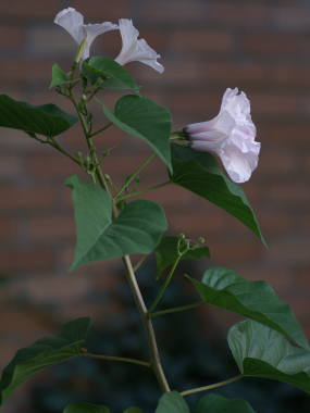 植物園にあった木立性のアサガオです。ヒルガオの仲間なので昼間に花が咲きます。花は普通の朝顔と同じような形をした、薄いピンク色の花を咲かせます。花は日照時間が短くなると花芽が形成される短日植物で、沖縄では秋から自然と花を咲かせるそうです。九州や本州、北海道では日が短くなる秋になると気温が下がってしまうので、植物園などの加温した温室内でないと花が見られないようです。
