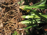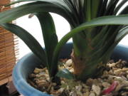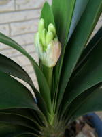 花が咲かない場合は、秋から冬の間に低温に合わせなかった事、根詰まりや根腐れ、肥料不足などによって生育が妨げられている場合が考えられます。クンシランは1年で葉が6枚以上増えると花が咲くようなので、あまり増えていない場合は生育不良が考えられます。他に蕾をつけるにはある適度の明るさが必要なので日照不足も考えられます。クンシランは強い日差しを嫌うので、遮光ネット越しの日光に当てるなどします。![]() クンシランの蕾 3月上旬 |