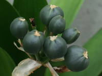 クンシランは同じ株の花粉では結実しないので、別の鉢植えのクンシランと交配させます。別の種類のクンシランを交配させると、違った種類のクンシランが出来るので、面白いと思います。クンシランは種まきで苗が作られる事が多く、同じ品種同士を結実させても、親と全く同じ花は咲き難いようです。10ヶ月ぐらいすると実が熟すので種が採れたら、春の3月〜4月頃に種を蒔きます。すぐには大きくならないので、翌年の春の4月から5月頃に定植します。![]() クンシランの実 6月下旬 |