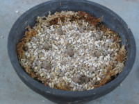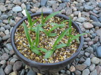 春の3月頃に行います。浅い鉢植えに用土は赤玉土(小粒)、鹿沼土(小粒)、山砂の等量混合土やミズゴケの単用などを使用します。間隔は2から3cmぐらいの密集植えにして、覆土は約2cmぐらいします。球根の上下はつるつるした方が下になるように乗せますが、もし、どちらか分からない場合は横に寝せてかまいません。花の咲きそうのない小さな球根も植えて球根を太らせます。写真は底の3分の2ぐらいの根が伸びる所をミズゴケ、残りは赤玉土(小粒)、鹿沼土(小粒)、山砂を等量入れて植え替えました。翌年には球根が倍以上増えます。| 3月下旬 |