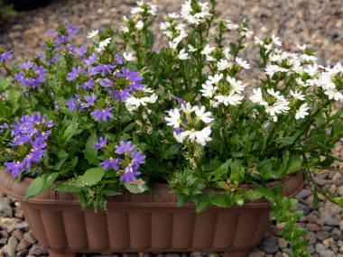 スカエボラはオーストラリア原産の匍匐性植物です。茎が這うように伸びるので、ハンギングバスケットや吊り鉢にされる事があります。花は手を広げたような形の小さな花が沢山咲き、紫や白、桃色の花もあります。花期がとても長く、5月から10月の間、長く花が咲き続けます。