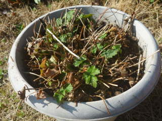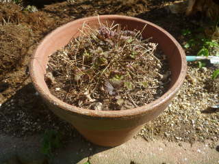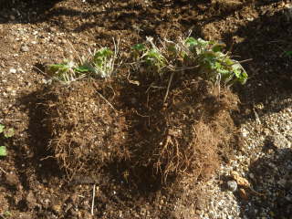 すぐに根詰まりするので、鉢植えは毎年行ったほうが良いです。時期は新芽が伸びる3月頃が理想的です。根鉢の周りを3分の1ぐらい壊して植え替えたり、大きくなり過ぎた場合や鉢の数を増やしたい場合は、株分けを兼ねて行うとよいです。庭でも数年して増え過ぎてしまったら、株分けを兼ねて植え替えます。用土などは植え付けの項目と同じです。![]() 植え替え前 |
