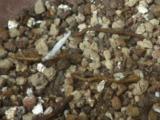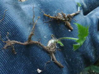 一鉢から沢山の苗を作る事ができます。太さ2mm以上の根を、長さ2、3cmぐらいずつに切って、平鉢や箱などに3cmぐらいの間隔で軽く土が被るように埋めておきます。腐って枯れるのもあるので、沢山埋めておいたり、根に芽が付いたものがあればそれを利用すると成功しやすいです。時期は3月頃、明るい所に置いて乾き過ぎと過湿に注意して水やりします。5月頃には芽が出てくるのでポットに仮植えして育て、秋になったら鉢に定植するとよいです。![]() 太さ2mm以上の根を利用する |