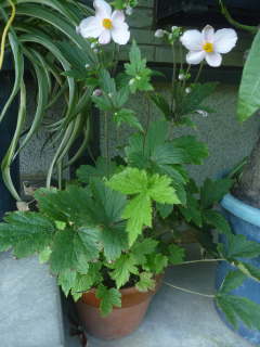ウィティフォリア(A.vitifolia)というネパール、ヒマラヤ、中国西部に自生している高性で一重咲きの種類と、フペヘンシスとの交配で出来た園品種品が鉢花としてよく出回っています。花の時期は7月から10月頃、草丈は高いですが、矮性のチャボシュウメイギクとの交配で出来た品種などもあります。![]() 矮性の園芸品種 |